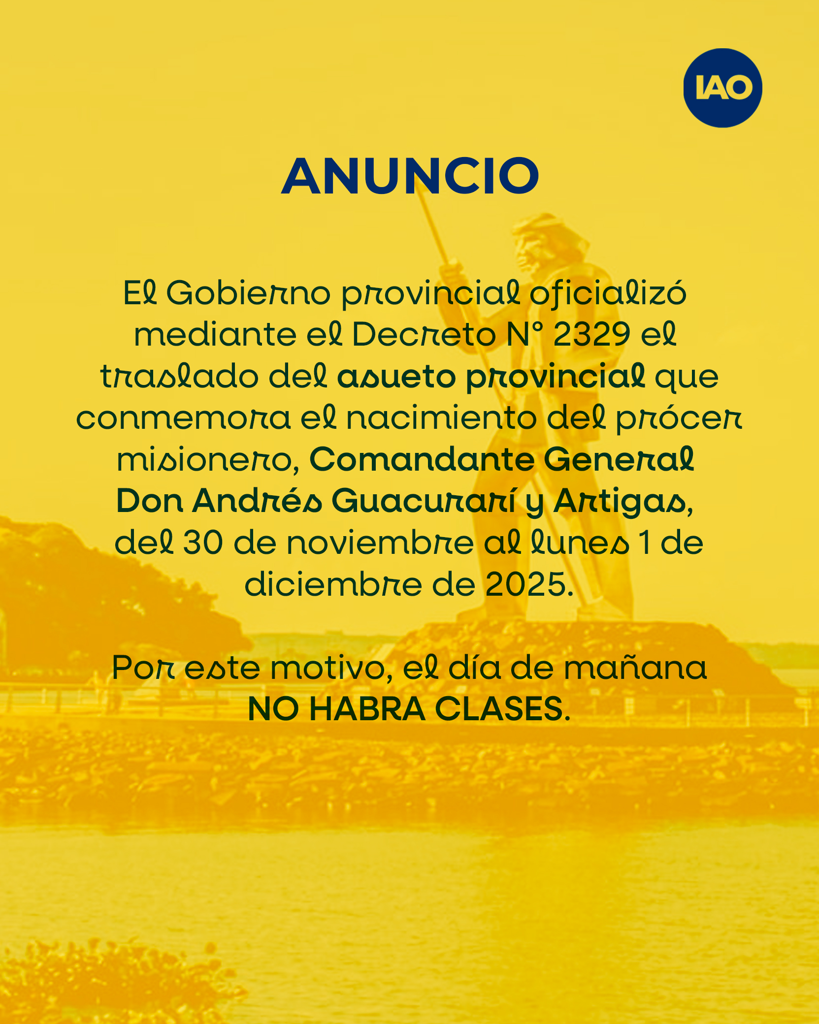 El Consejo General de Educación (CGE) confirmó el traslado del asueto provincial correspondiente al 30 de noviembre, fecha en la que se recuerda el natalicio del Comandante General Andrés Guacurarí y Artigas. Mediante la Resolución 7778/25, el organismo adhirió al Decreto Provincial Nº 2329, que establece que el descanso administrativo se cumplirá el lunes 1 de diciembre en todas las instituciones y dependencias educativas de Misiones.